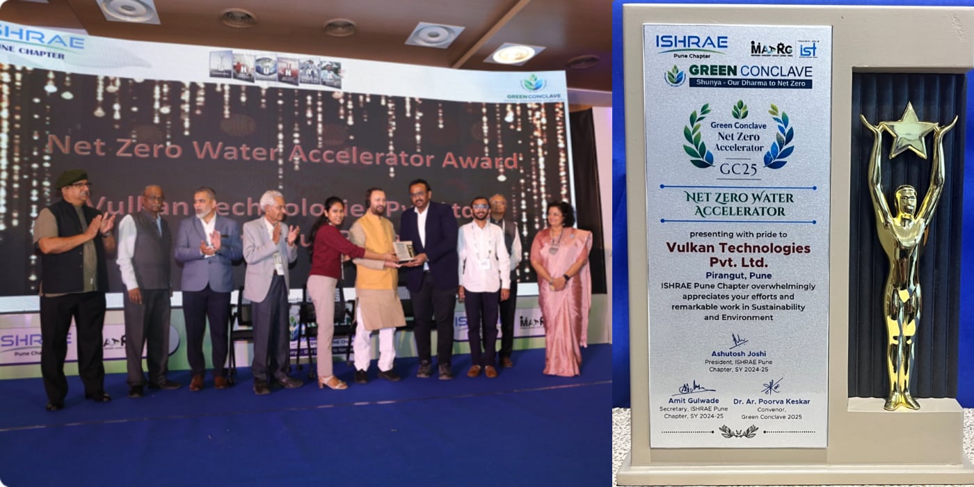 Vulkan Technologies Pvt. Ltd. has been awarded the prestigious Net Zero Water Accelerator Award by the Indian Society of Heating, Refrigerating and Air Conditioning Engineers (ISHRAE), Pune Chapter.