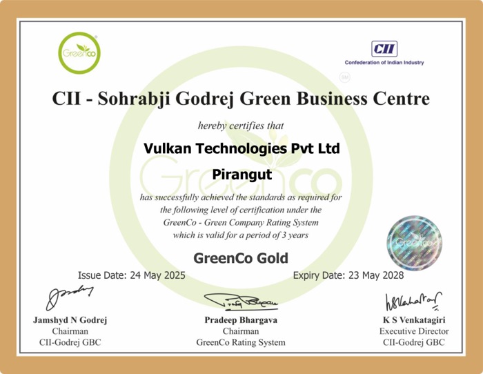 We are pleased to inform you that VULKAN Technologies India (VTI) has been awarded the prestigious “GreenCo Gold Rating” by the Confederation of Indian Industry (CII). GreenCo is a green rating system developed by the CII that aims to recognize and encourage the growth of world-class green companies in India. It is a voluntary program that evaluates and improves the environmental performance of Indian companies.